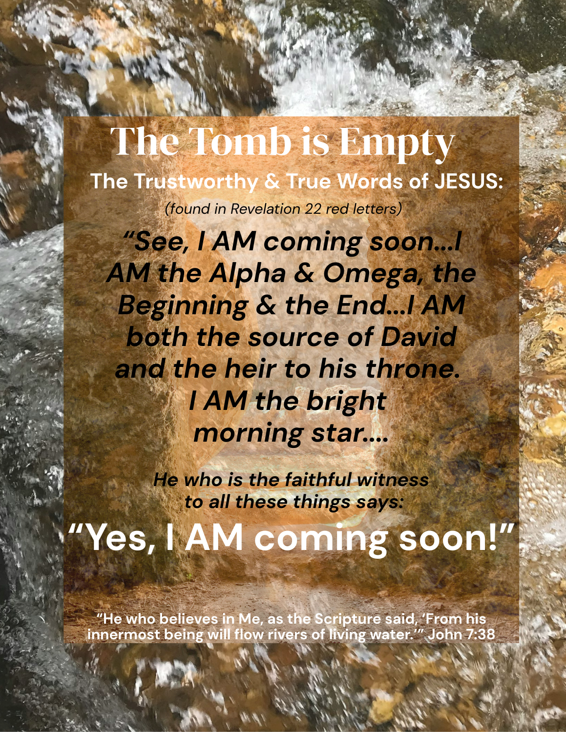 I too wish to only speak of the things I have seen and heard, through the Word of God, through the voice of the Holy Spirit who confirms the Word and reminds of what Jesus said. So, as the Holy Spirit reminded me to keep the main thing the subject of this month’s message, I too will remind you of the Good News of the gospel. And the mystery of it is that the gospel message is for everyone who will believe in Jesus Christ, the perfect Lamb of God, who takes away the sins of the world, who redeems us (bore the penalty for sin in the world) so we can be restored to the Father and receive eternal life. Another amazing truth is it is a free gift of salvation by the grace of God and His only son Jesus who gave Himself as a ransom and was victorious over sin, death and the grave. So, as many celebrate this Resurrection Sunday, and participate in Easter activities, remember that the tomb is empty, Jesus has risen and He is alive and is coming back again for all who believe and trust in Him to be Lord and Savior of their lives. Don’t delay. JESUS’ WORDS: “I AM COMING SOON!